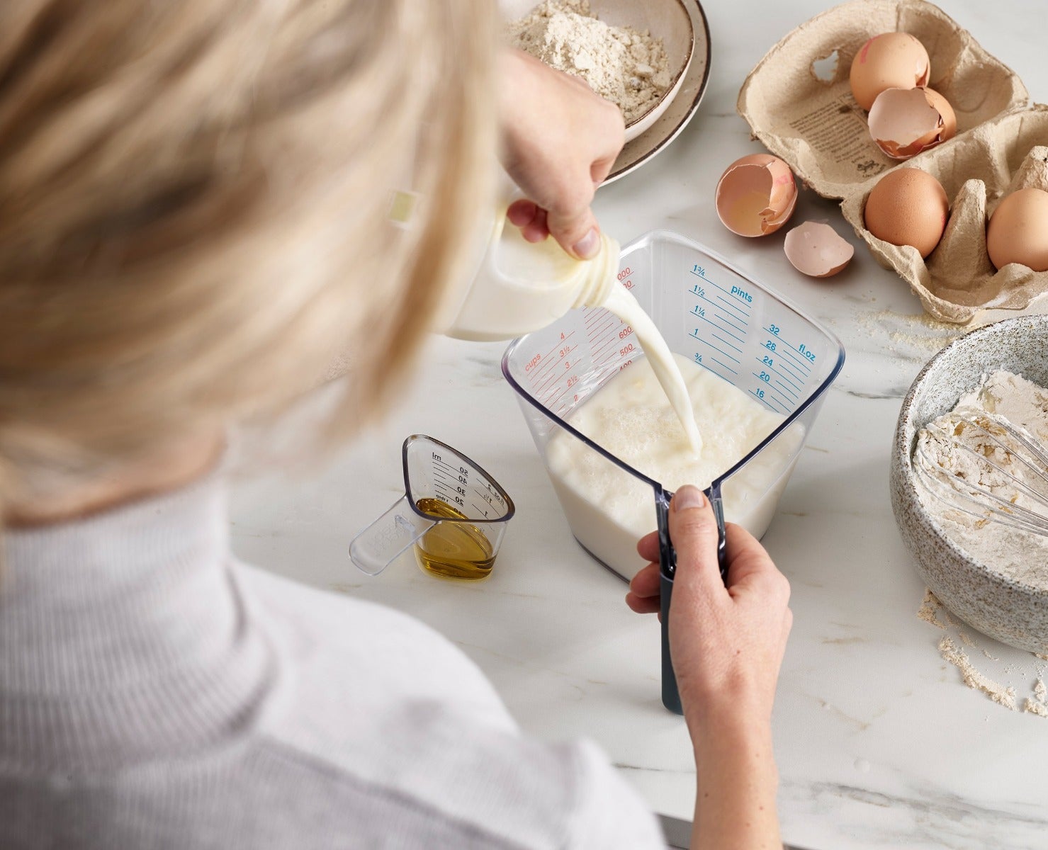 There’s no need to bend down to read this large measuring jug as it has an angled design with clear measurements, allowing you to read off the volume from above as you pour.