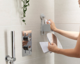 This compact shower shelf takes the hassle out of shower storage. It’s large enough to hold all your essential soap and shampoo bottles and features hooks for a razor, sponges and flannels and a hinged, shatter-resistant acrylic mirror.