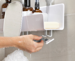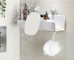 This large shower shelf takes the hassle out of shower storage by holding soap bars, shower gels and shampoo bottles and features hooks for razors, sponges and flannels and a hinged, removable, shatter-resistant acrylic mirror.