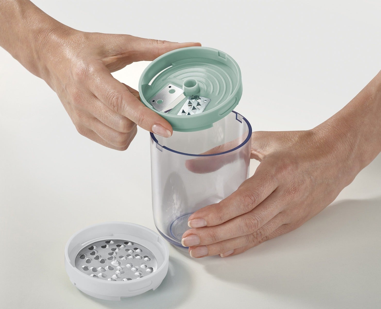 - Container base collects food as you cut